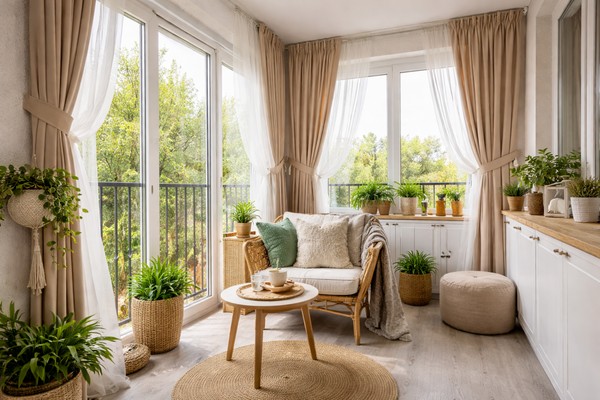 Третья задача - формирование уюта. Даже практичное балконное пространство хочется сделать визуально приятным. Шторы и тюль способны смягчать линии, делать интерьер более жилым и тёплым.